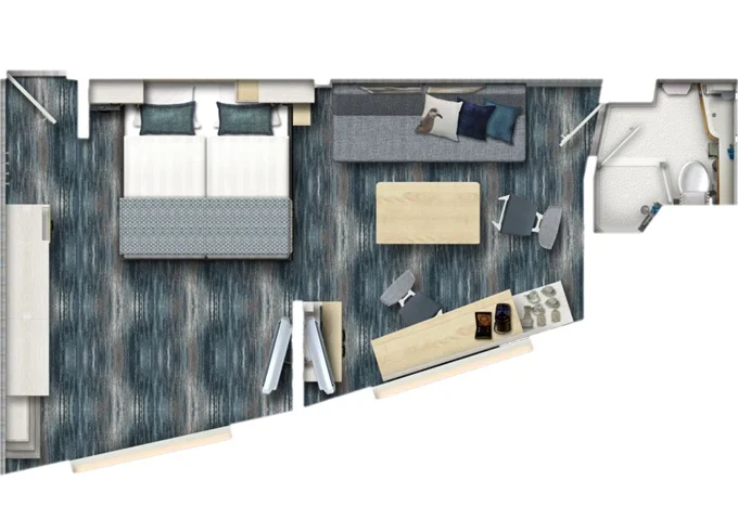 | SKAO - Schöne Aussicht Suite 39 m² + balkón 13-14 m² s ležadlami a hojdacou sieťou. 7-14. paluba. Max 4 osoby. Výhody Suite. | 13 916 € 3 479 € za osobu | ||
