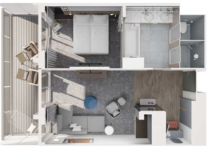| JBBO - Junior Suite s balkónom B 26 m² + balkón 7 m² so stoličkami a podnožkami. 8-12. paluba. Max 4 osoby. Výhody Junior Suite. | 8 998 € 8 998 € za osobu | ||